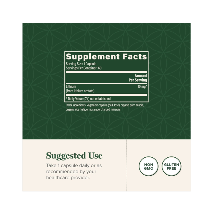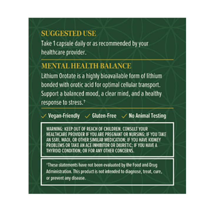 Lithium is a natural trace mineral with a rich history of therapeutic use that can play a major role in supporting a healthy mood and mental well-being. A balanced and calm mind can have a profound impact on your overall wellness. Global Healing Lithium Orotate supplement combines lithium with orotic acid to promote a joyful mood, a resilient stress response, and optimal cognitive function. Each vegetarian capsule delivers 10 mg of elemental lithium.